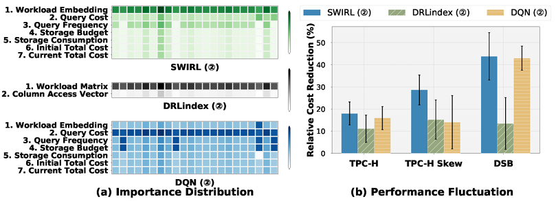 O12(状态表示):基于学习的索引推荐在表示排列不变性属性方面不稳定,其中基于查询计划的工作负载表示最为关键。图(a)显示了状态表示特征的重要性分数分布,其中每行对应状态的一个特征,每列是一个工作负载样本。实验观察到,工作负载表示是状态表示中最关键的特征。这是因为现有基于学习的索引推荐依赖工作负载,工作负载表示对于它们在训练期间为给定工作负载识别有效索引至关重要。然而,现有工作负载表示存在问题,因为它们无法保留排列不变性属性。对于查询被随机打乱(即以不同顺序组织)的相同工作负载,索引推荐无法产生一致的相对成本降低(即返回相同的索引)。这个根本原因是索引推荐按顺序处理工作负载中的查询,这与批量处理工作负载的无序性质相矛盾。