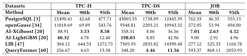 ●估算准确性Q-Error:实验评估PostgreSQL和openGauss中数据库优化器的假设调用。此外,实验评估基于树的模型XGBoost和LightGBM、基于注意力的模型LIB和基于Transformer的模型QueryFormer。本文还使用可解释机器学习算法识别这些模型的关键输入特征。