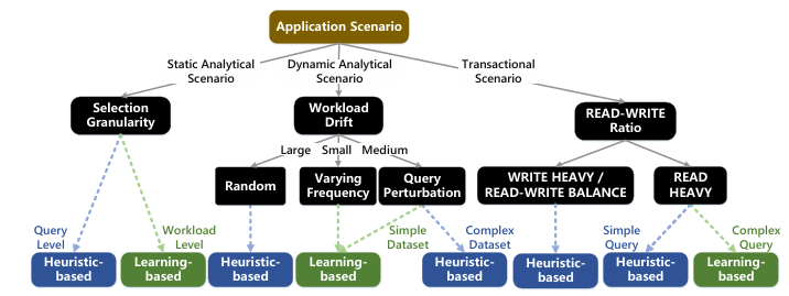 ● 工作机制:即索引推荐是否采用学习组件。基于工作机制,索引推荐可分为两类:具有一系列预定义算法的基于启发式的方法;涉及具有不同学习范式(如强化学习、分类和回归)的各种学习组件的基于学习的方法。