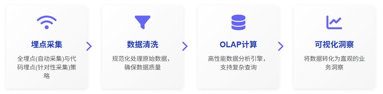 一个成熟的分析系统通常包含四大关键组件:埋点采集、数据清洗、OLAP 计算和可视化洞察。在埋点采集环节,企业需要在全埋点(自动采集所有行为)和代码埋点(针对性采集关键行为)之间做出选择,两者各有优势,需根据业务场景灵活应用。
