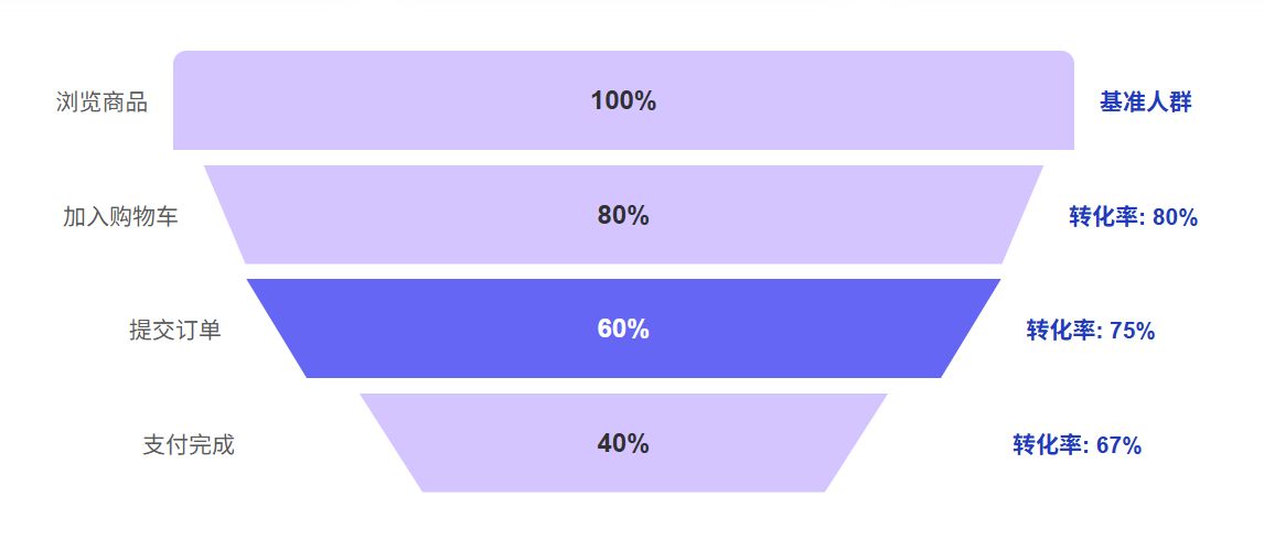漏斗分析是识别用户流失节点的有力工具。以电商购物车为例,通过构建"浏览商品→加入购物车→提交订单→支付完成"的转化漏斗,可直观发现各环节的转化率和流失率。