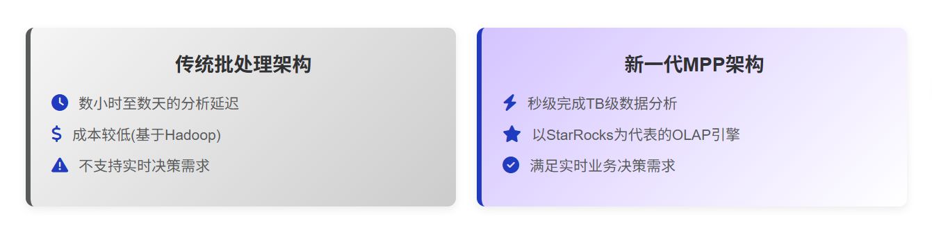 StarRocks 为代表的新一代 OLAP 引擎,采用 MPP(大规模并行处理)架构,能够在秒级内完成 TB 级数据的复杂分析查询,实现了技术壁垒的突破。