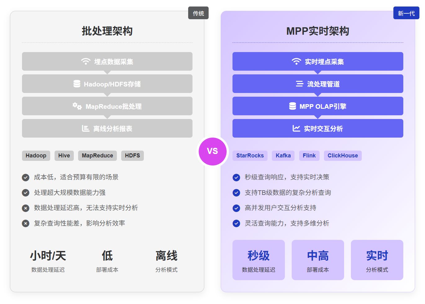 传统的用户行为分析系统多基于 Hadoop 等批处理架构,虽然成本较低,但面临严重的响应延迟问题,通常需要数小时甚至数天才能完成大规模数据分析,无法满足现代企业对实时决策的需求。
