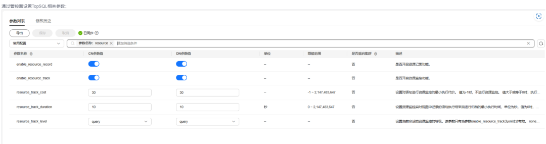 TopSQL功能默认打开(use_workload_manager,enable_resource_track,enable_resource_record参数均默认为on),GUC参数详细介绍如下:
