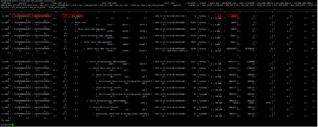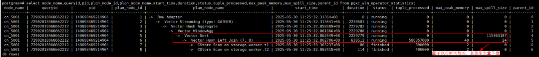 功能展示:我们下发某个查询,在另一个会话中查询实时算子视图pgxc_wlm_operator_statistics,结果如下: