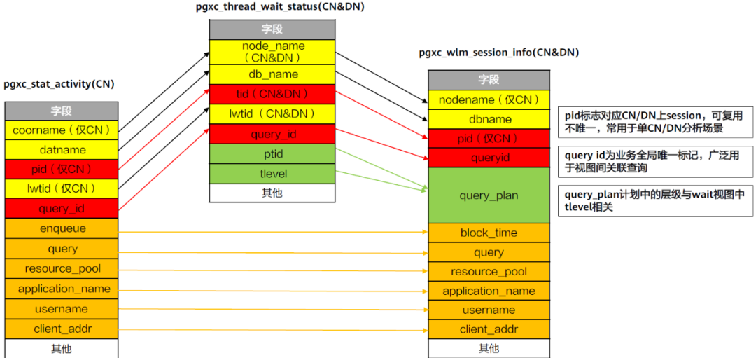 不同视图从不同维度统计业务在数据库中的运行状态,因为或多或少都包含部分同类字段,可用于后续关联分析,此处给出历史TopSQL视图常交互的其他视图: