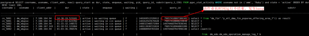 步骤1:查询pgxc_stat_activity活跃视图,找出长时间运行不结束的异常作业