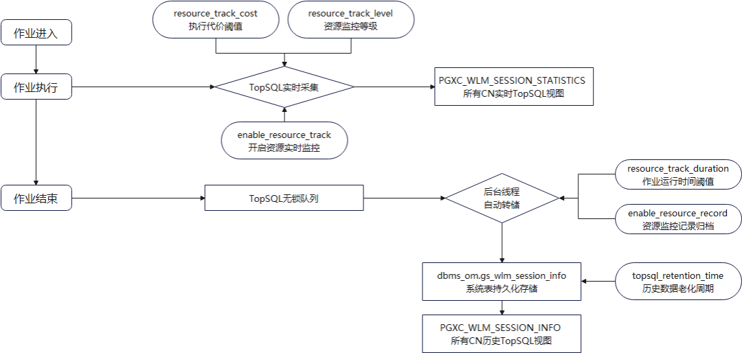 作业下发执行后,内核通过打桩记录作业的各项资源信息,如内存、CPU、下盘、IO和网络信息等,作业执行完成后该资源信息后先存在无锁队列中,资源管理后台辅助线程将该数据信息定期转储到dbms_om.gs_wlm_session_info系统表中,后续通过topsql_retention_time定期老化数据。