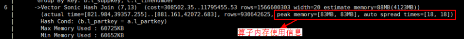 当发现作业内存整体使用较高,query级别的TopSQL无法记录算子的实际资源信息,此时可以设置TopSQL的监控级别为perf,query级别与perf级别的TopSQL差异主要在query_plan,perf级记录更详细执行信息,较query级性能损耗5%以内,perf级别的TopSQL的query_plan字段可显示算子的时间actual_time,memory,rows和buffer等信息。