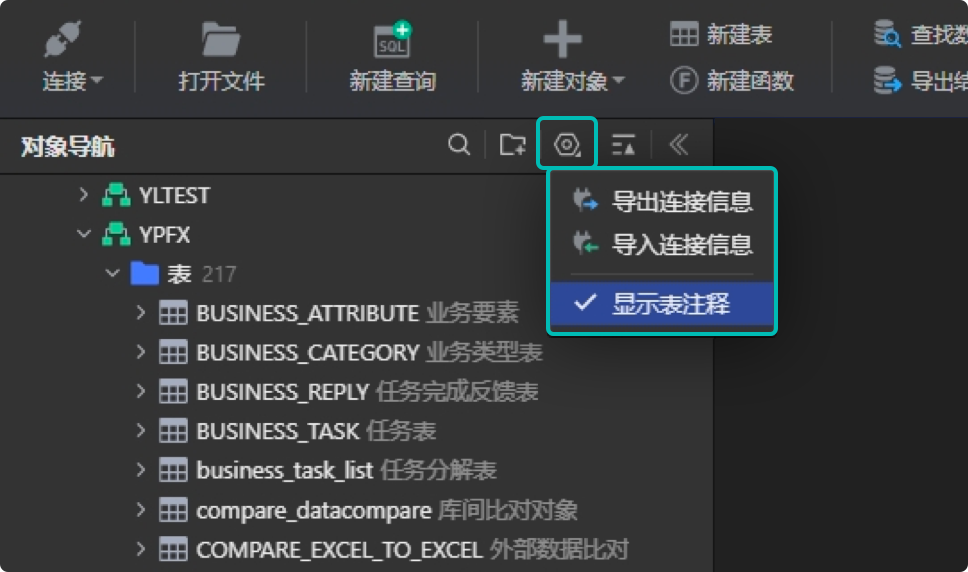 还有一个小却有用的更新,我们在对象导航中的表对象新增了表注释,用户可以自行配置是否显示/隐藏表注释。