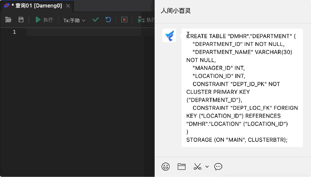 虽迟但到的小百灵 AI 助手,率先集成 Qwen3-32B、DeepSeek-32B 模型(预计 7月上线 Qwen3 满血版),助力用户完成代码解释、报错分析、代码生成、SQL 优化、达梦专家知识检索等工作。