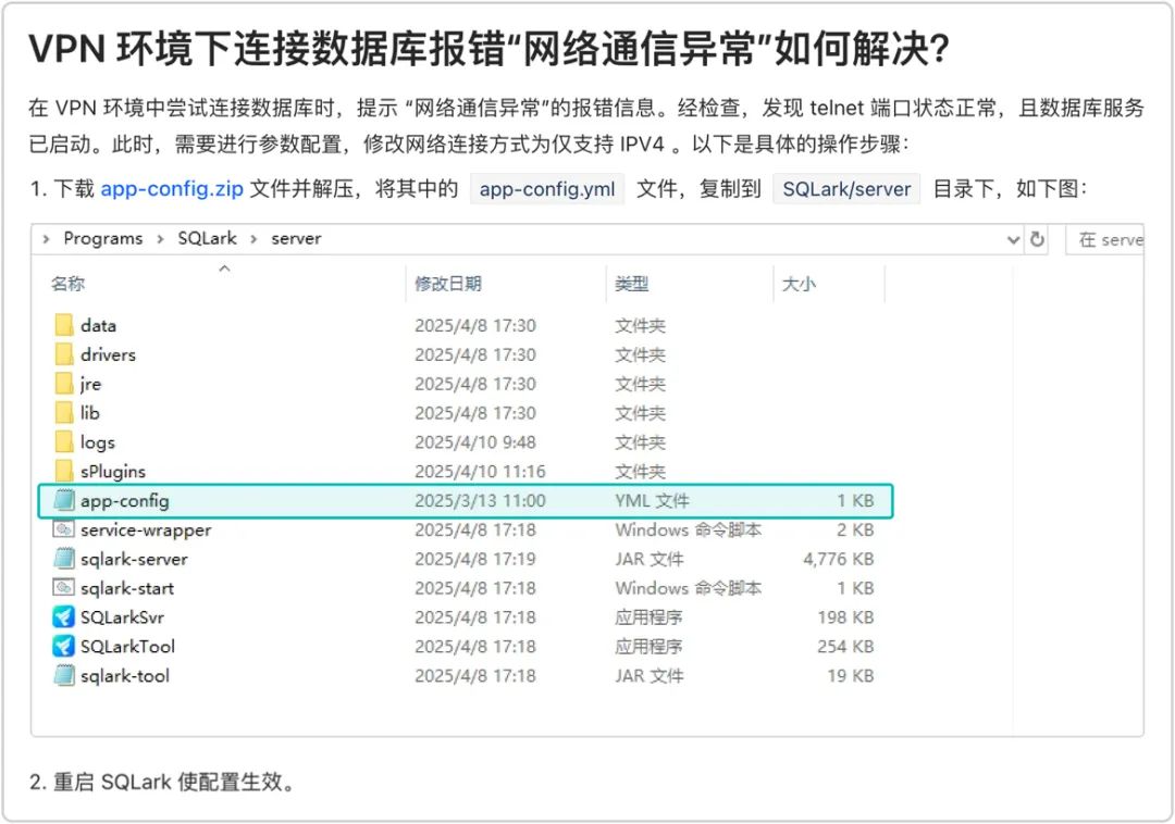 用户通过 VPN 方式连接数据库时,如出现“网络通信异常”报错,可以通过配置 app-config.yml 文件中的 preferIPv4Stack (优先支持 IPV4) 参数来解决,详见 SQLark 官网 - 参考文档 - FAQ。在 V3.4 版中该参数修改不生效,V3.5 版修复了该问题。