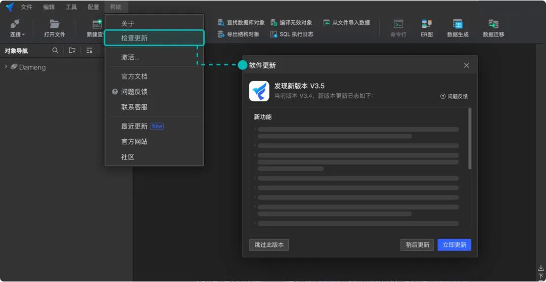 在客户端的菜单栏点击 帮助 | 检查更新 选项,选择 立即下载 即可更新至最新版本,也可访问 SQLark 官网www.sqlark.com下载最新版本客户端。
