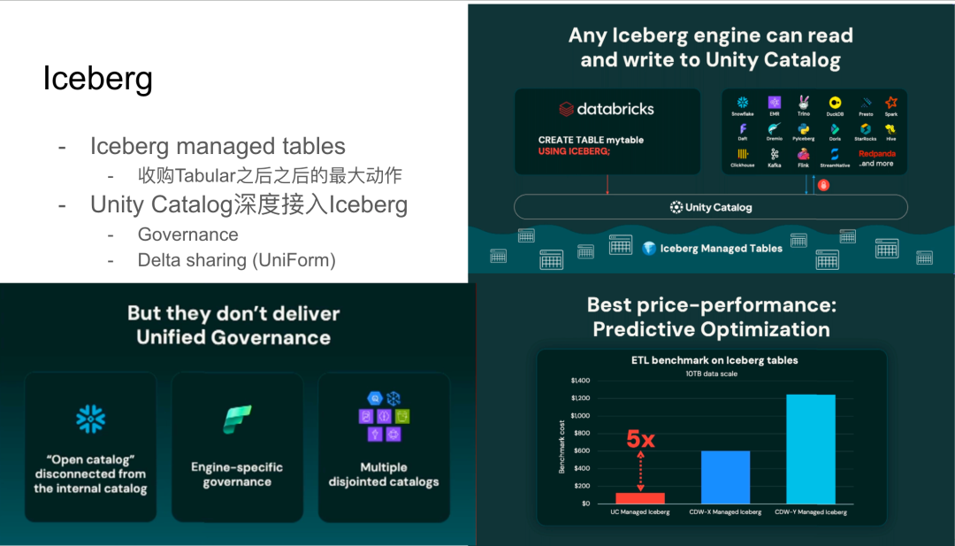 Databricks在数据领域的重要发布之⼀是针对Apache Iceberg的深度整合。Iceberg作为⼀种开放表格式,旨在解决数据湖中的事务性、模式演进和性能问题。Databricks通过收购Tabular公司,进⼀步强化了其在Iceberg⽣态系统中的地位。这次发布会推出了Iceberg managed table,利⽤Unity Catalog来管理Iceberg表的写⼊,并对Iceberg的读写性能进⾏了显著优化。这意味着Databricks不仅⽀持⾃⾝产品读取Iceberg表,还⽀持Snowflake、EMR、Trino等外部引擎进⾏读写,他们宣称这是唯⼀允许外部引擎写⼊Iceberg表的统⼀⽬录。尽管Databricks强调其性能优势和开放性,发布会后最大的争议还是在讨论这里的功能是否只能在闭源Unity Catalog中可用。