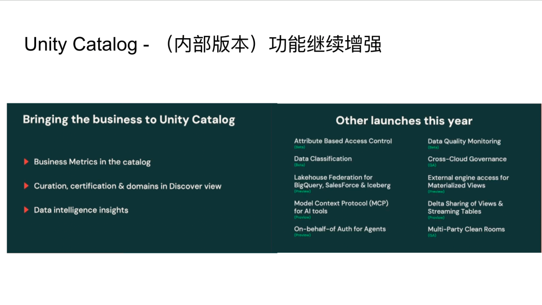 Unity Catalog作为Databricks Lakehouse平台的核⼼组件,持续进⾏功能增强。本次⼤会强调了其在连接企业数据与业务部⻔、提供数据发现功能以及通过数据注⼊(Data Ingestion)提供洞察⽅⾯的改进。Unity Catalog旨在通过⾃动化⽅式连接数据分析部⻔和业务部⻔,实现业务指标的统⼀管理,并帮助⽤户发现不同部⻔间的数据,提升数据易⽤性。此外,它还通过⼤型语⾔模型(LLM)或⼩型AI组件辅助理解数据,并增强了对多数据源、监控和多云监管的⽀持。