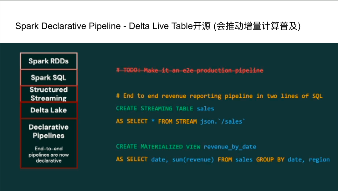 声明式管道( Declarative Pipeline):回顾Spark的发展历史,从繁琐的RDD编程到Spark SQL,再到Structured Streaming和Delta Lake,每⼀次迭代都旨在提升易⽤性和功能。声明式管道(Declarative Pipeline)的引⼊,旨在简化复杂数据⼯作流的构建。尽管Databricks的闭源产品Delta Live Tables早已具备类似功能,但将其开源将极⼤地普及增量计算模式,使更多⽤户受益。