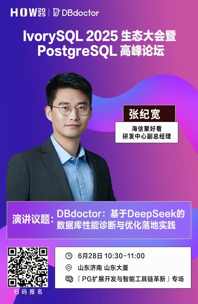 6月27日-28日,IvorySQL 2025 生态大会暨 PostgreSQL 高峰论坛将在济南盛大开幕!本次大会将以PostgreSQL技术生态为核心,聚焦全球数据库技术发展趋势、开源创新与行业实践,打造产学研用深度融合的技术交流平台。大会为期两天,围绕PostgreSQL进行协作、学习和创新,共同推动PostgreSQL技术的未来。