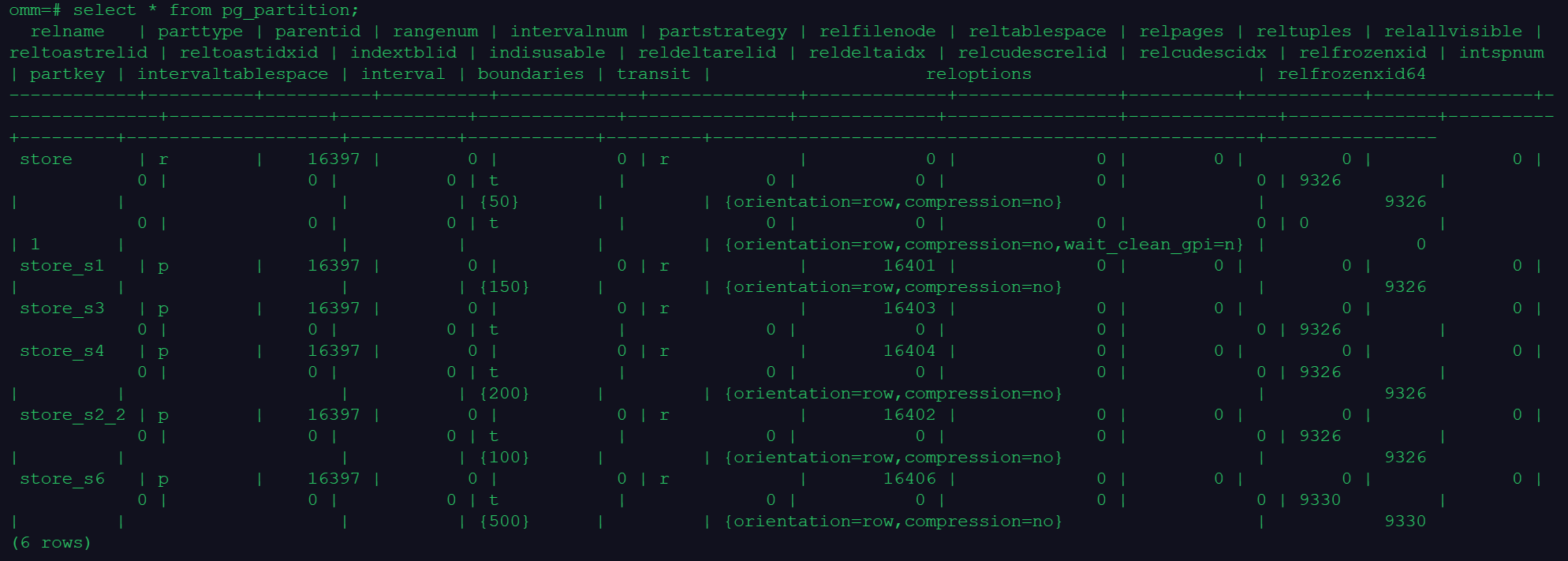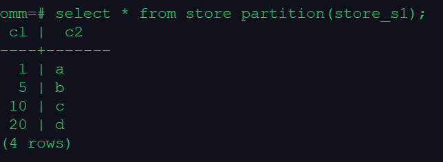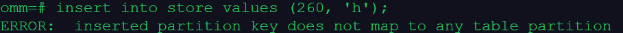 insert into store values (1, 'a'), (5, 'b'), (10, 'c'),(20, 'd'),(50, 'e');注:小于50的数都会插入到store_s1中!!!