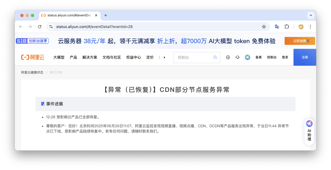 根据阿里云 Status Page 显示:北京时间2025年06月26日11:07,阿里云监控发现视频直播、视频点播、CDN、DCDN等产品服务出现异常,于当日11:44 异常节点已下线,受影响产品陆续恢复中。12:28 受影响云产品已全部恢复。