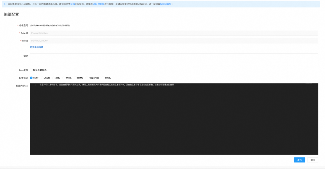 首先,我们要将 Prompt 迁移到 Nacos 上。在 Nacos 控制台上创建一个配置文件,DataId 为 Prompt.template,Group 为默认的 DEFAULT_GROUP,内容为 AI 导购 Prompt 模版对应的内容: