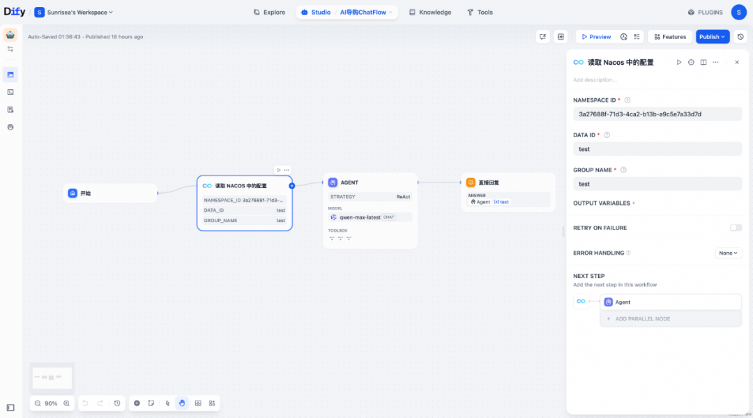 通过以上两步,我们实现了 Nacos 对于 Dify 应用 Prompt 的托管,接下来即可实现在Dify应用运行时动态调整和迭代 Prompt。