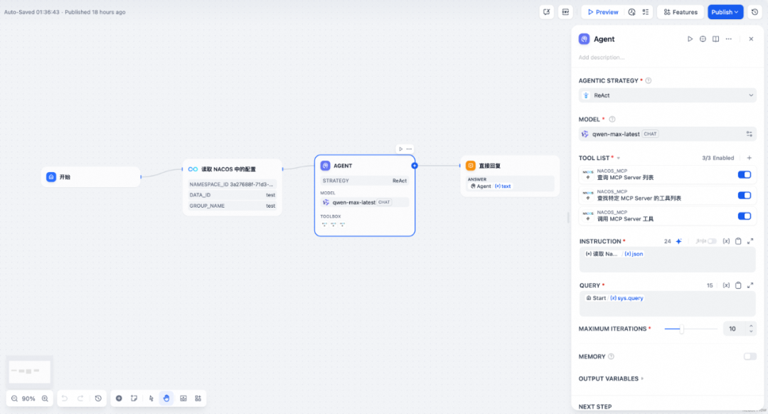 而完成配置之后,在随后的运行时中,Dify可以实时的感知 Nacos 中注册的 MCP Server服务,而无需对 Dify 应用进行重新编辑和部署,并根据任务实现对于 MCP 的路由。
