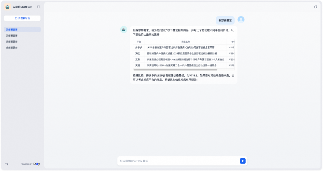 首先,我们调用 AI 导购,希望他给我们一些露营的装备建议: