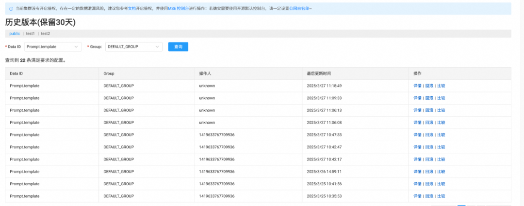 Nacos 还支持变更历史历史,在历史版本界面,可以查看所有使用过的历史 Prompt 版本,并进行回滚,这样即使 Prompt 效果不够满意,也可以一键复原:
