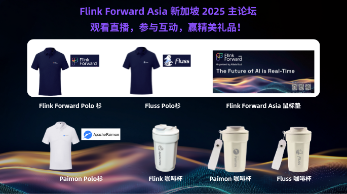 为各位开发者准备了丰富的精美周边,不仅有 FFA 限定周边,还有 Flink、Paimon 以及新朋友 Fluss 的周边首次亮相!参与直播互动与讲师登场环节,均有机会获得精美礼品。快来点击直播预约,精彩周边不容错过!