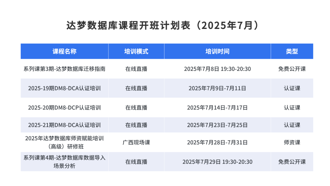 以下是2025年7月的达梦数据库课程开班计划,建议学员根据自身基础与职业规划选择合适的课程,系统学习并考取认证,为个人职业发展增添竞争力。