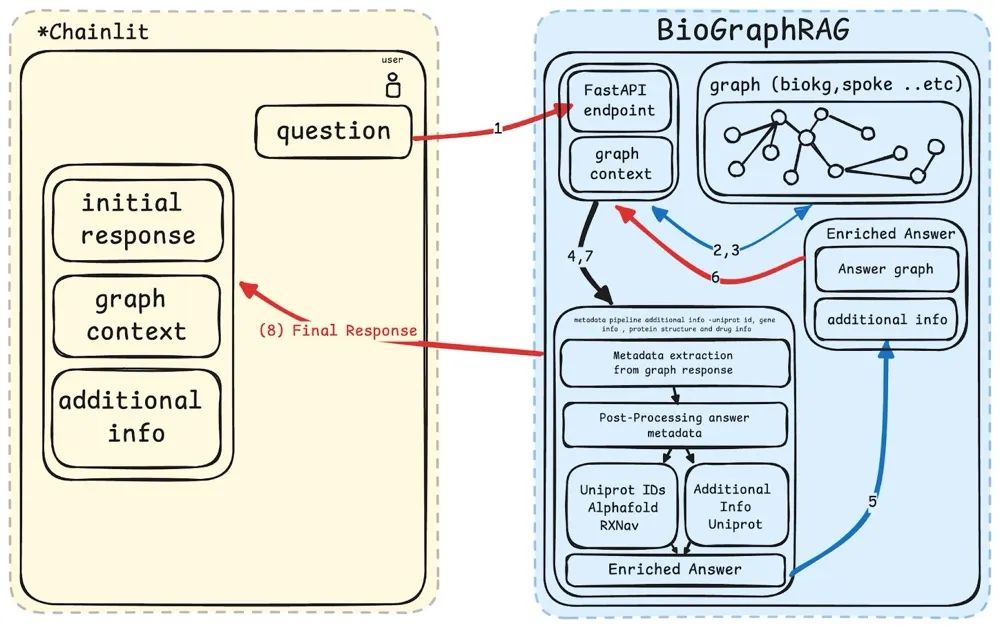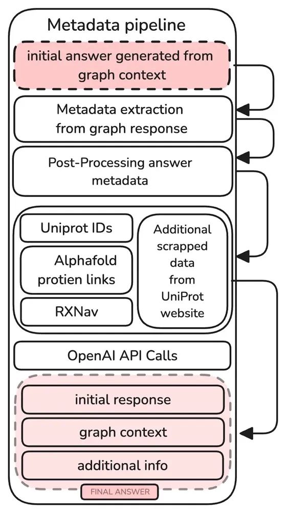 通过调用查询特定元数据源的附加模块来增强初始答案。 这些包括基因相关信息、通过 AlphaFold 的蛋白质结构以及药物相关数据。 增强过程将这些附加信息与初始答案合并,以创建更全面的响应。