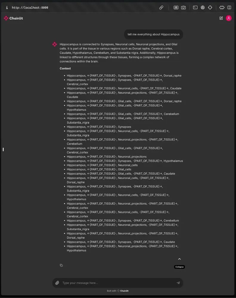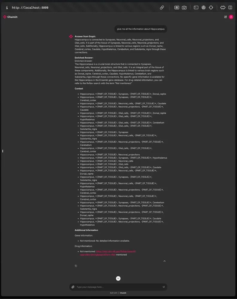 如果用户查询的信息并不在知识图谱中,BioGraphRAG 会自动回退到使用 OpenAI 驱动的 LLM 的通用查询方法。 这确保了当知识图谱覆盖不全时,也能给用户带来良好的查询体验。