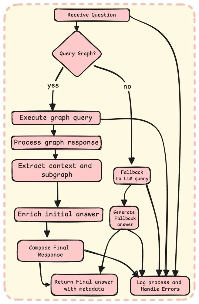 在每个阶段都包含日志记录,尤其是在图谱查询和答案增强期间。 这对于调试、性能监控和确保每个组件按预期运行至关重要。 错误处理机制捕获并报告问题,而不会中断整个过程。