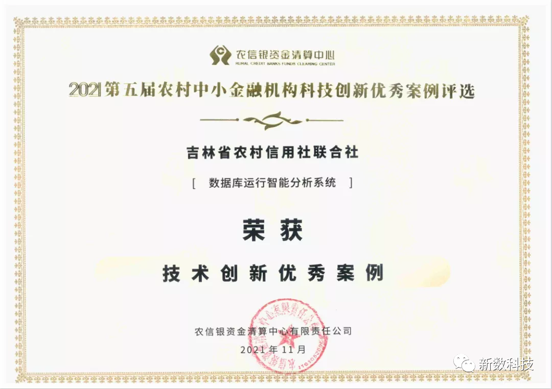 近日,由农信银资金清算中心主办、金科创新社承办的主题为“共谋科创新发展 成就农信新未来”的“2021农村金融科技创新与共享发展会议暨第五届农村中小金融机构科技创新优秀案例评选成果发布会”成功召开。在此次案例评选活动中,共30家农村金融机构提交了110个相关案例,其中吉林农信携手新数科技打造的“数据库运行智能分析系统”项目得到评审专家的一致好评,获得了“技术创新优秀案例”。