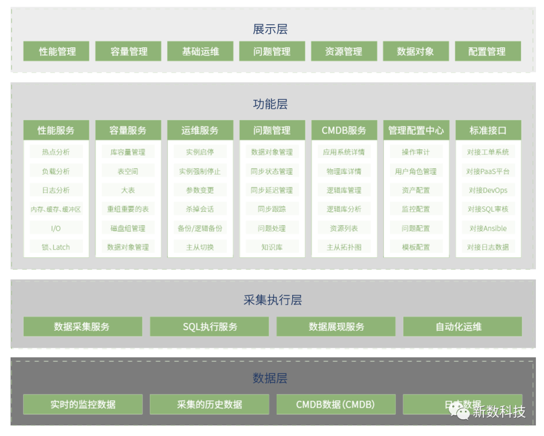 为实现上述要求,吉林农信联合北京新数科技提出了智能化、自动化、服务化、可视化、高效率的dbPaaS数据库统一云管理平台的创新设计理念,集中力量构建了数据库运行智能分析系统(以下简称“智能分析系统”),打造了吉林农信数据库“四化一率”的管理体系,同时解决了数据库监控指标覆盖面窄、疑难问题分析定位难、应急处置时效性低、运维人员技术水平参差不齐等突出问题,提高了整体运维效率和主动防范风险的能力,增强了数据库运行的安全性和稳定性,为吉林农信科技发展提供充足的科技动力,为业务发展提供了强大的运营支撑。
