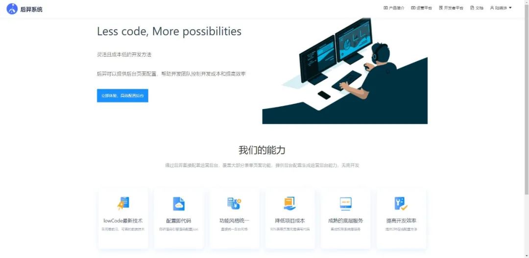 后羿是符合低代码平台的定义的一款产品,提供了可视化编排能力的开发语言。相较于一阶段的配置平台,设计了首页门户、运营平台、开发者平台、技术文档平台,提供了二次开发和生态建设能力,支持各种数据通道开发方式,大幅提升了产品力。最终都是为了完成技术平台到技术产品的转变和将低代码开发变得更加简单易懂、更加快速开发。