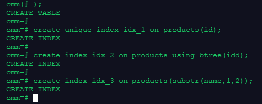 1.创建表products, 分别为表创建一个unique索引1,指定b-tree索引2和表达式索引3