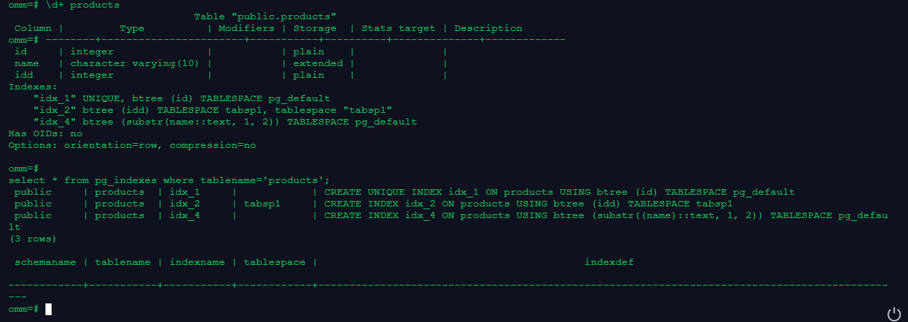 4.使用\d+和系统视图pg_indexes查看索引信息