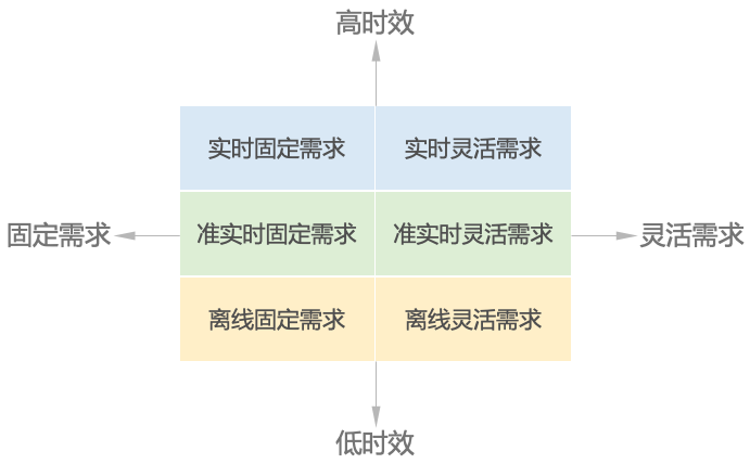 然后,我们再按照数据分析与应用需求的灵活性进行划分,分为固定需求和灵活需求。固定需求通常以事件驱动或者固定的时间周期支持数据分析应用;灵活需求根据用户的随机、临时需求支持分析应用。