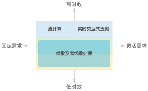 我们通过需求的灵活性与时效性两个维度,将业务场景简单的分为了六种,但是从技术架构的角度,其实只有三种,因为准实时和离线的可以使用同样的架构。于是,从技术角度我们可以将三种场景从技术角度划分为:流计算、实时交互式查询、微批及离线批处理。