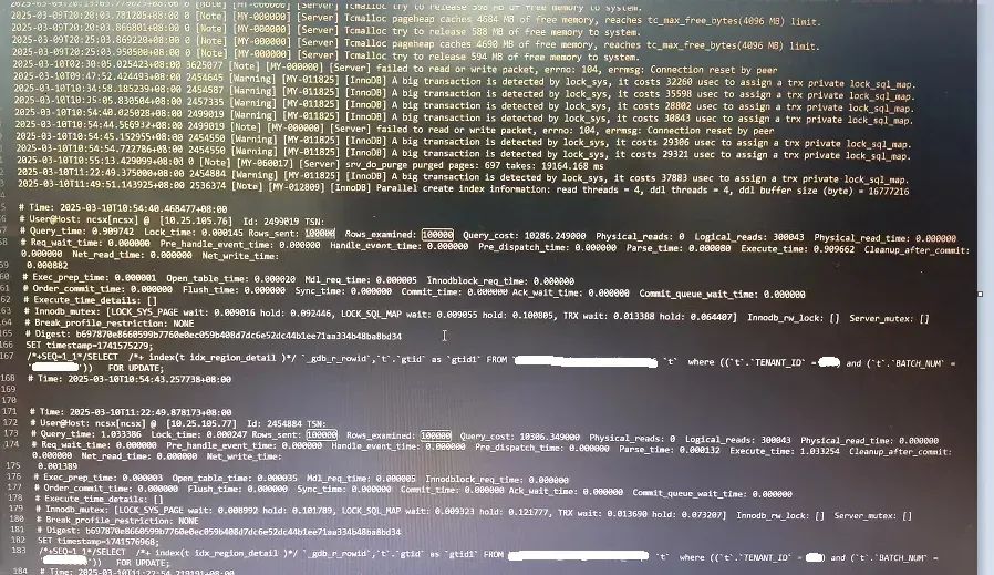 登陆数据库检查日志发现在业务报错时间点出现大事务