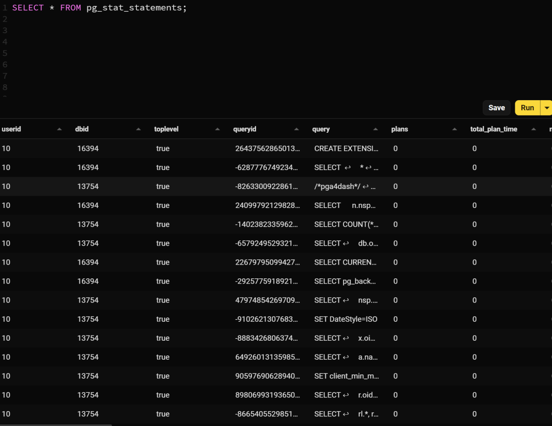 SELECT * FROM pg_stat_statements;执行结果如下: