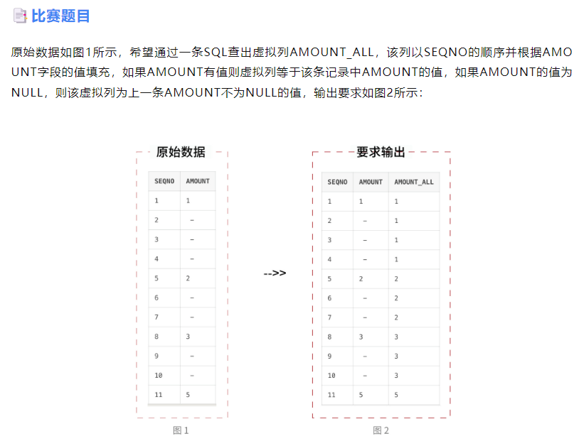 --建表并生成测试数据:create table test_gen as(select 1 as seqno,1 as amount from dualunion allselect 2 as seqno,null as amount from dualunion allselect 3 as seqno,null as amount from dualunion allselect 4 as seqno,null as amount from dualunion allselect 5 as seqno,2 as amount from dualunion allselect 6 as seqno,null as amount from dualunion allselect 7 as seqno,null as amount from dualunion allselect 8 as seqno,3 as amount from dualunion allselect 9 as seqno,null as amount from dualunion allselect 10 as seqno,null as amount from dualunion allselect 11 as seqno,5 as amount from dual);