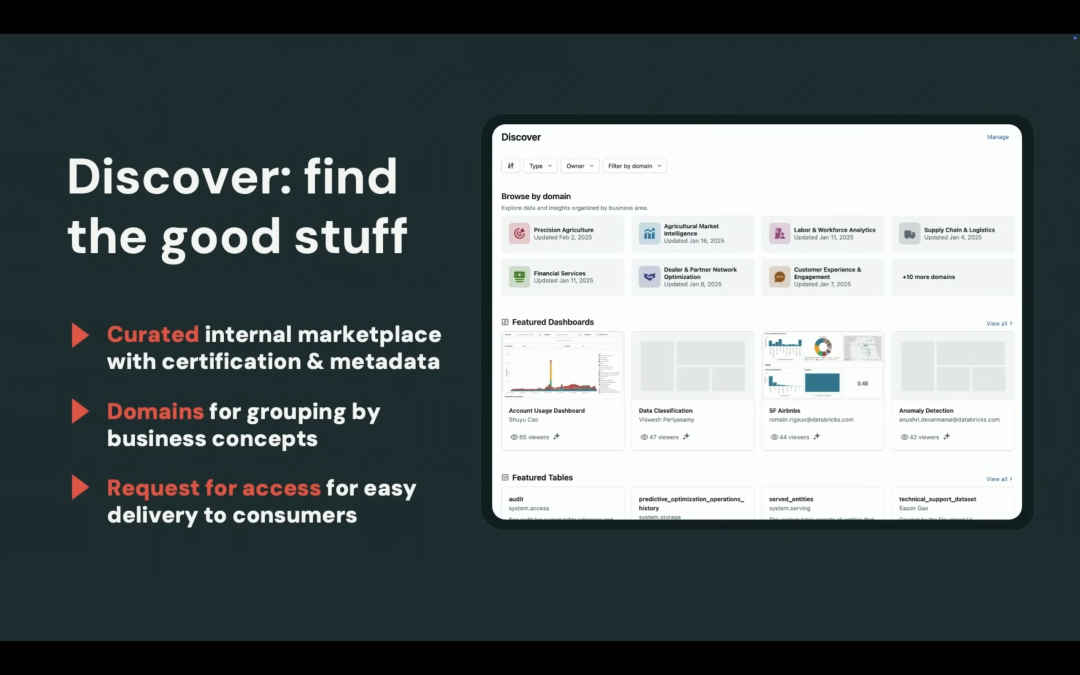 10、unity catalog metrics GA,去年发布的,核心是 catalog 里面有业务指标,方便业务人员和 AI 理解。