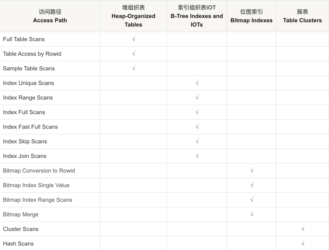 虽然上面列了几种表类型,但 下面主要还是介绍下堆组织的表(Heap-Organized Tables)的优化器访问路径,因为 Oracle 默认的表类型是堆表,所以需要重点了解下。