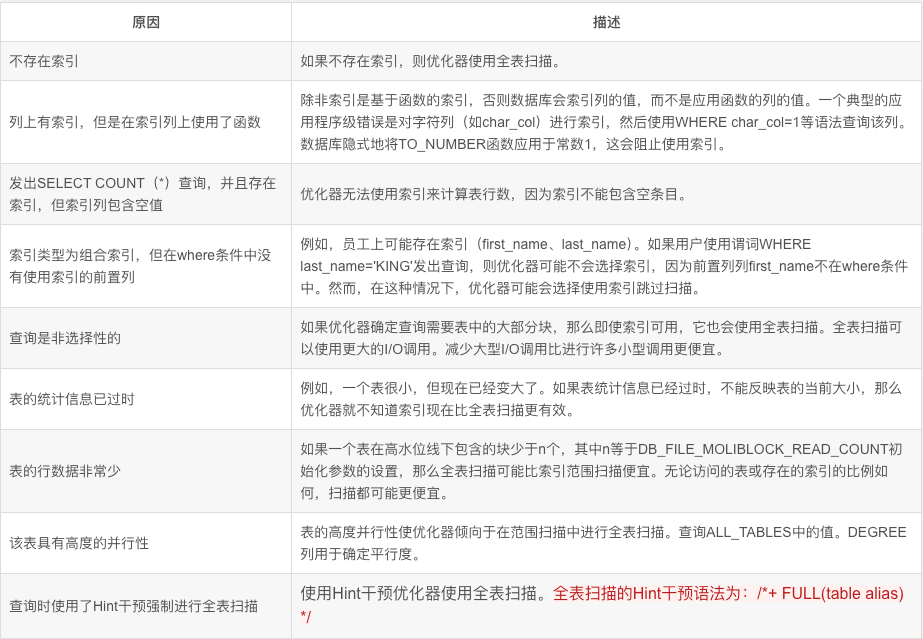 。一般来说,当优化器无法使用不同的访问路径,或者另一个可用的访问路径成本较高时,它会选择全表扫描(并不是所有的执行计划适合走索引扫描,小表走全表,大表走索引)。下表显示了选择全表扫描的典型原因。