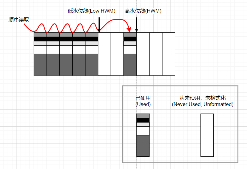 图例中空块表示为“从未使用,未格式化(Never Used, Unformatted)”;灰色块表示为“已使用(Used)”。箭头从左向右,落在每个用过的方块上,然后停在高水位线(HWM)处。