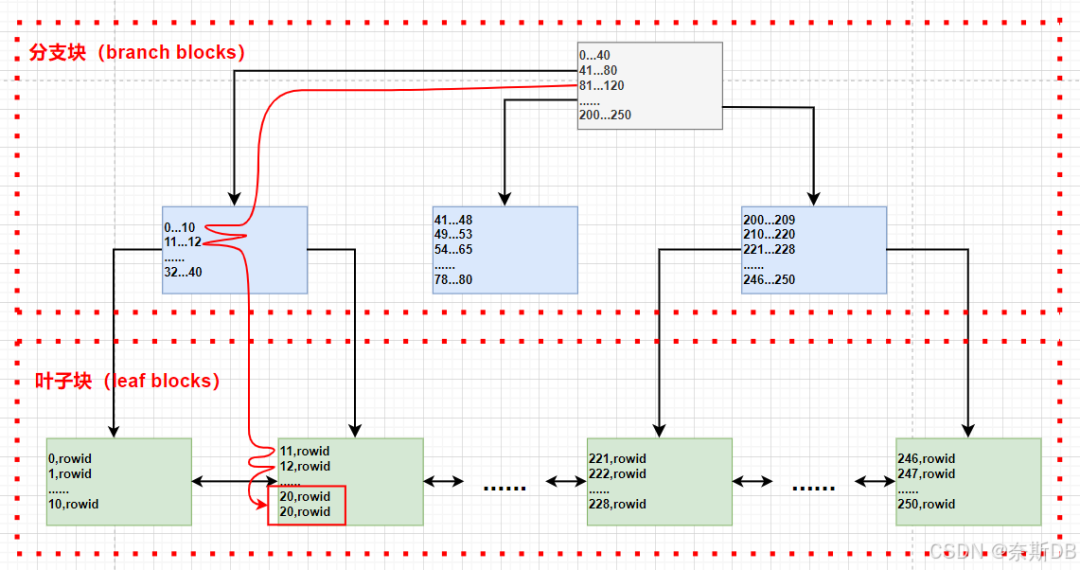 B 树簇索引将簇键值与包含数据的块的数据库块地址(DBA)相关联。例如,键 20 的索引条目显示了包含部门 20 中员工数据的块的地址: