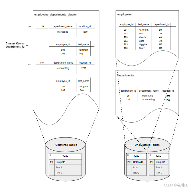 簇表是一组共享公共列并在相同的块中存储相关数据的表。当表被聚集时,单个数据块可以包含多个表中的行。例如,一个块可以存储 employees 表和 departments 表中的行,而不是只存储一个表中的行。