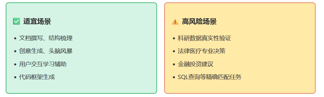 用户要明白,大语言模型本质是统计模型,输出置信度与事实准确性无必然联系。在科研、投资、法律咨询等高敏领域,模型错误后果严重。用户应将 AI 输出视为 “概率线索”,自行验证。